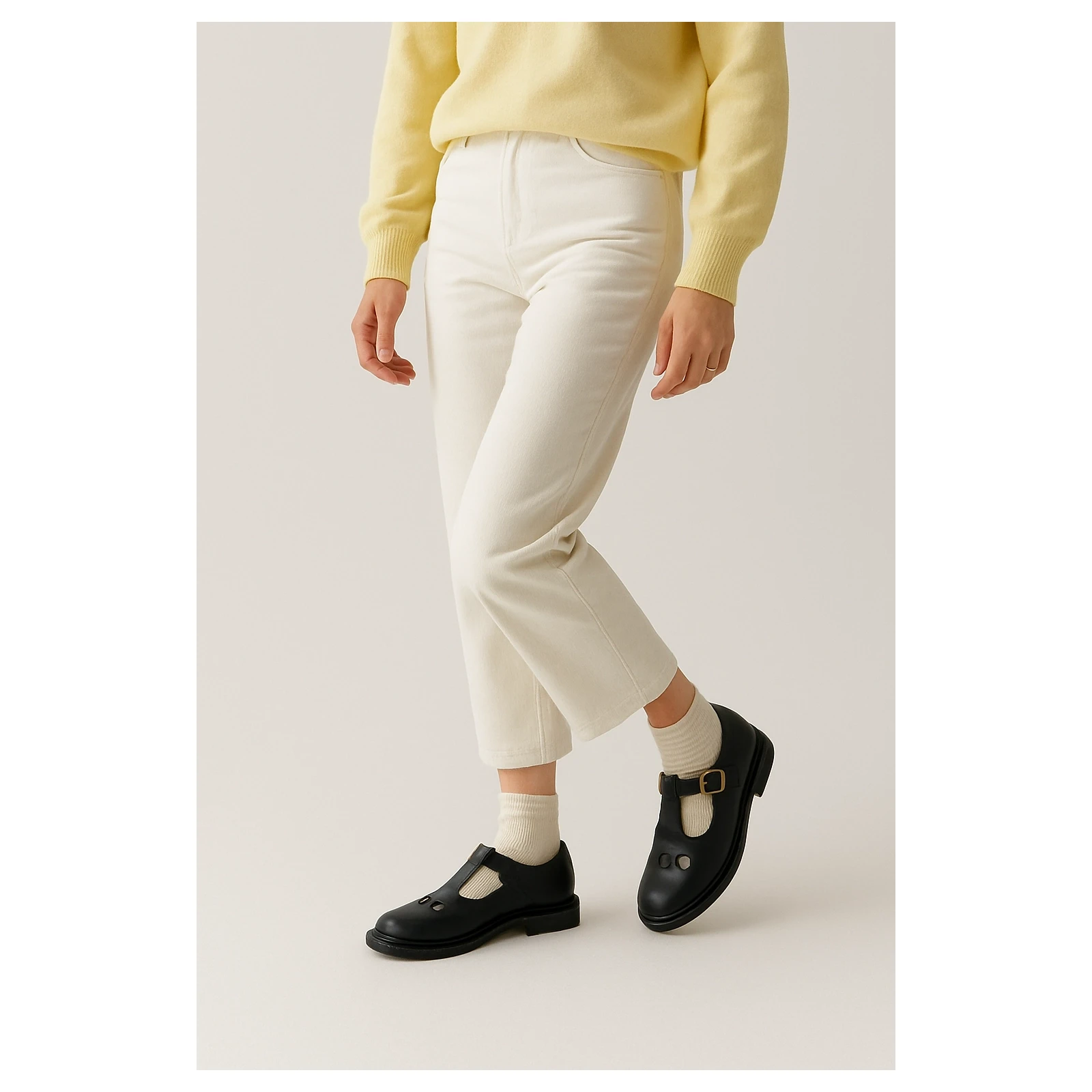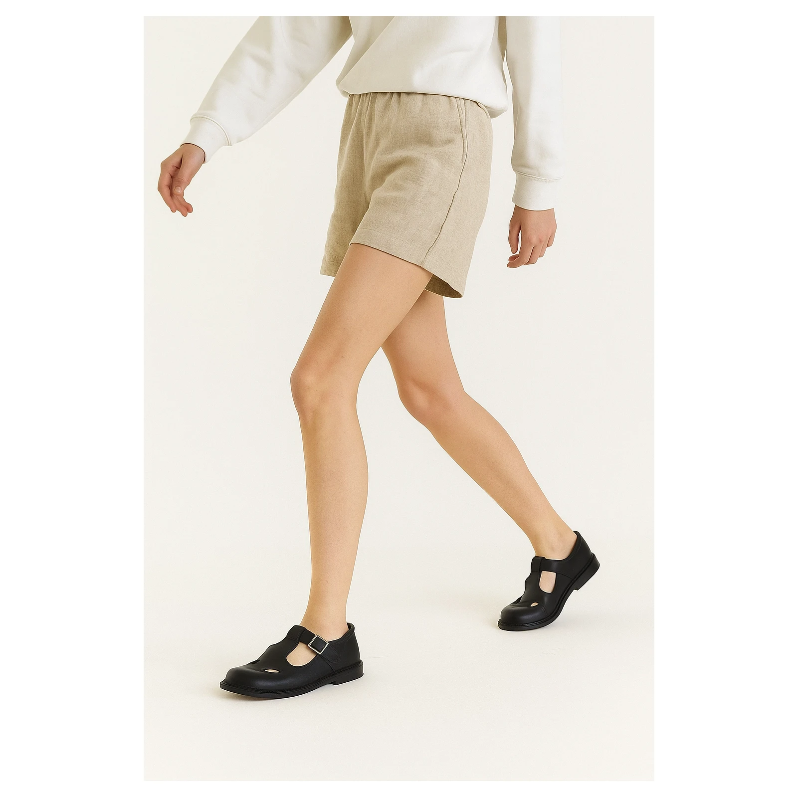 In Italien handgefertigte T-Bar-Schuhe für Damen aus pflanzlich gegerbtem, gefettetem, Schwarzem Rindsleder machen den Schuh leicht, aber widerstandsfähig. Hypoallergen bei Hautkontakt.