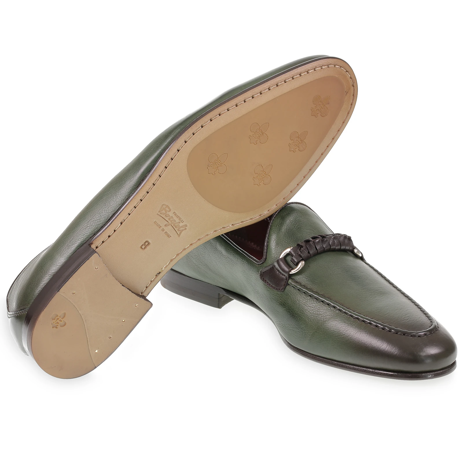 Herrenmokassin aus sehr weichem grünem Kalbsleder mit handgewebter Schlaufe. Manuelle Schattierung und genähte Ledersohle mit rutschfestem Gummioval. Wadenfutter. Hergestellt in der Toskana.