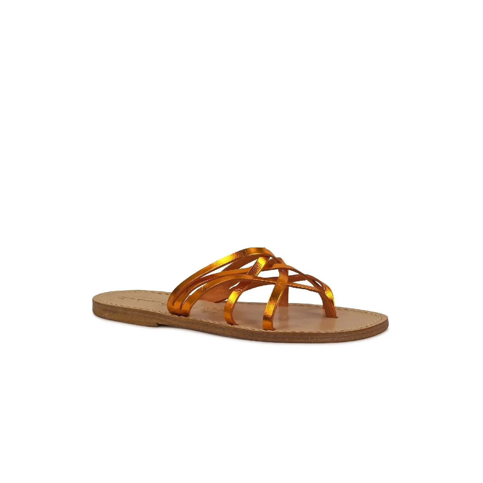 orange laminierte Riemchen-Sandalen für Damen aus gefettetem Rindsleder mit Ledersohle. Hand gefertigt in Italien von Experten in der besten Tradition des Leder-Handwerks und ohne den Einsatz ausländischer oder Kinderarbeit gefertigt.