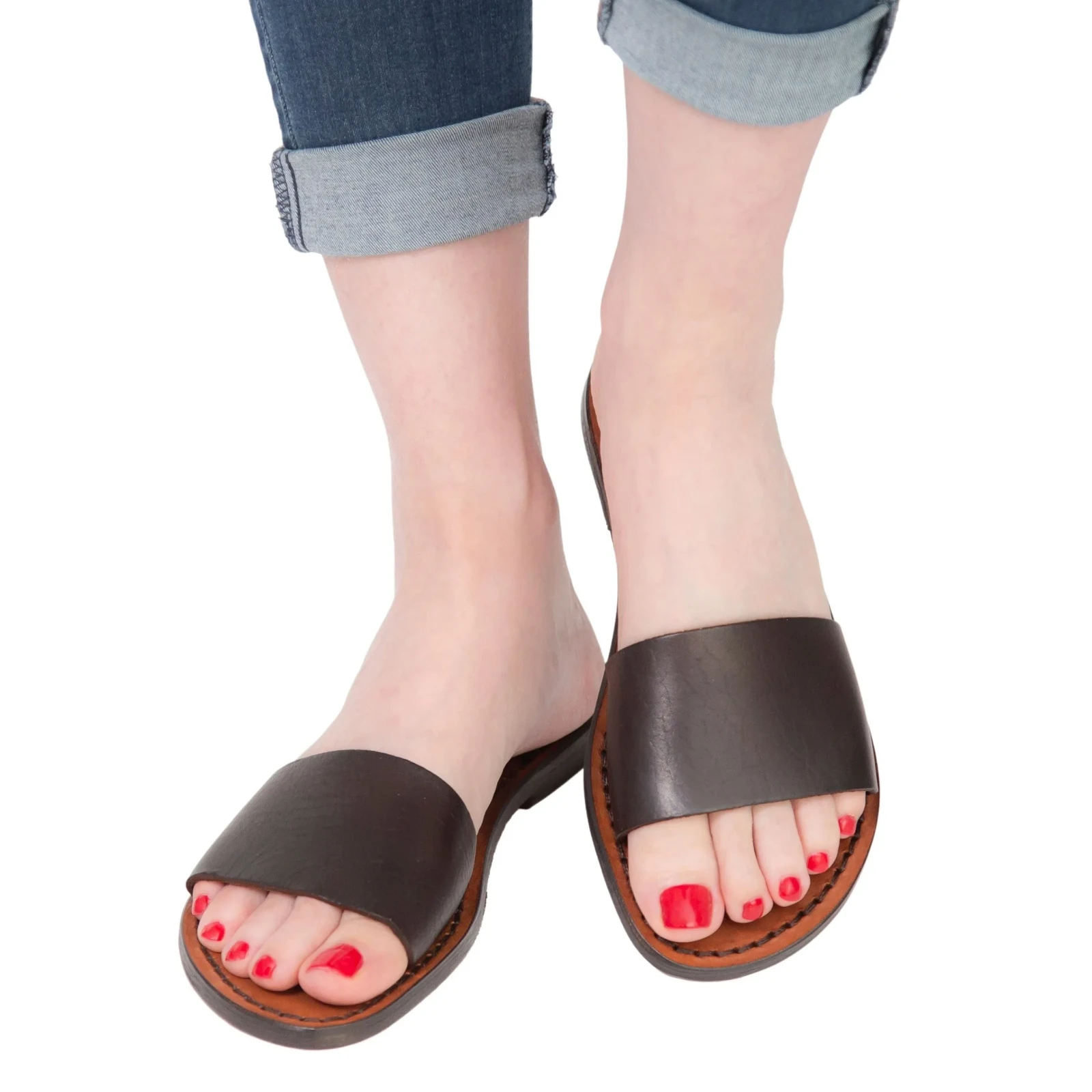 Hand gefertigte Damen-Slippersandalen aus dunkelbraunem Leder