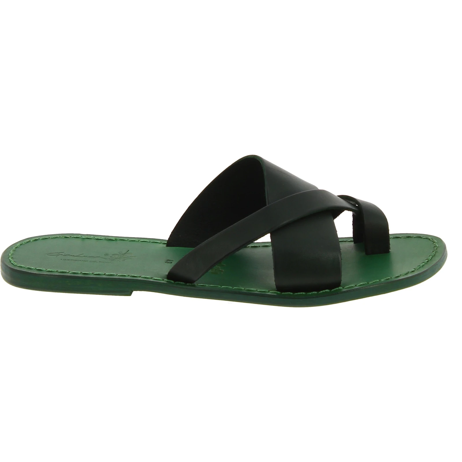 Flip-Flop-Hausschuhe aus geöltem grünem Rindsleder und Ledersohle, handgefertigt in Italien ohne fremde Arbeitskräfte, geschweige denn ein Kind, aber von erfahrenen Händen wie in bester Handwerkstradition.