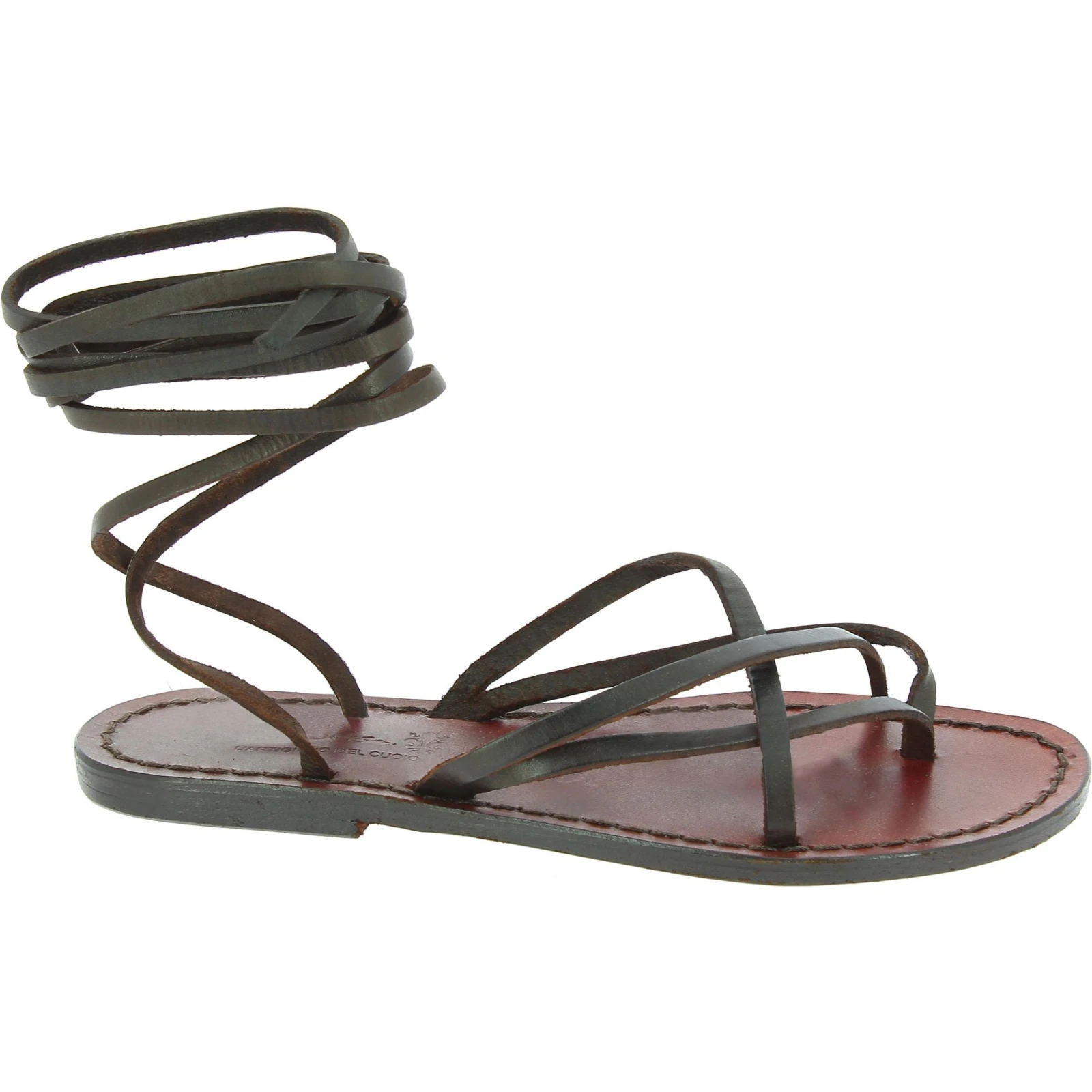 Dark brown greased vachetta womens strappy leather sandals with leather sole handmade in Italy without the use of foreign labor or child, but by experts in the best tradition of craftsmanship.