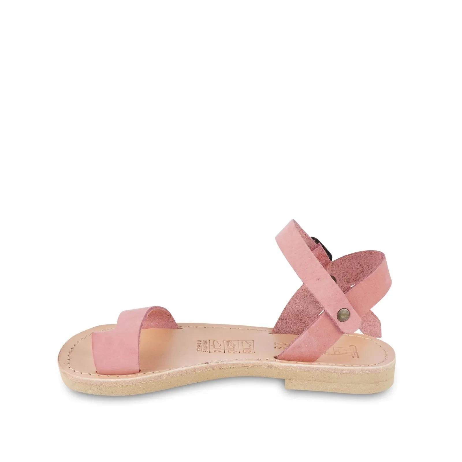 The Heron by Attica Sandals is a girl's sandal that features an adjustable ankle strap. The sandal is made of pink nubuck leather. The inner sole is in natural calfskin. The sole is made of special water-resistant, shock-absorbing, elastic rubber with non-slip properties. The model is available from 23 to 35.