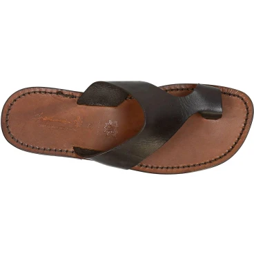 Dark brown calf leather thong sandals braid around the big toe and leather sole handmade in Italy without the use foreign or child labor, but by experts in the best tradition of craftsmanship.