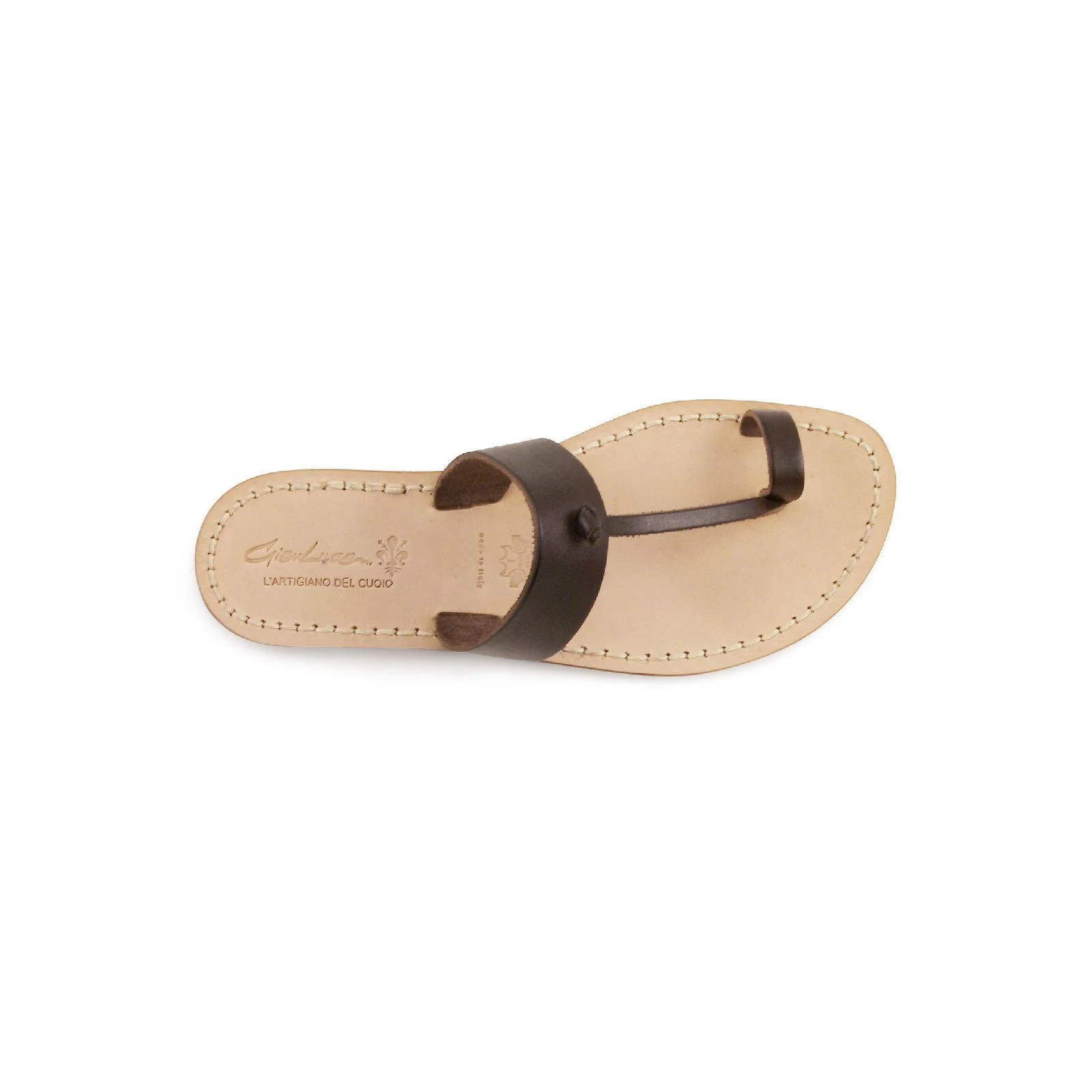 Dark brown greesed vachetta leather slades thongs around the big toe and natural leather sole handmade in Italy in the best tradition of craftsmanship.