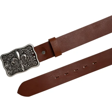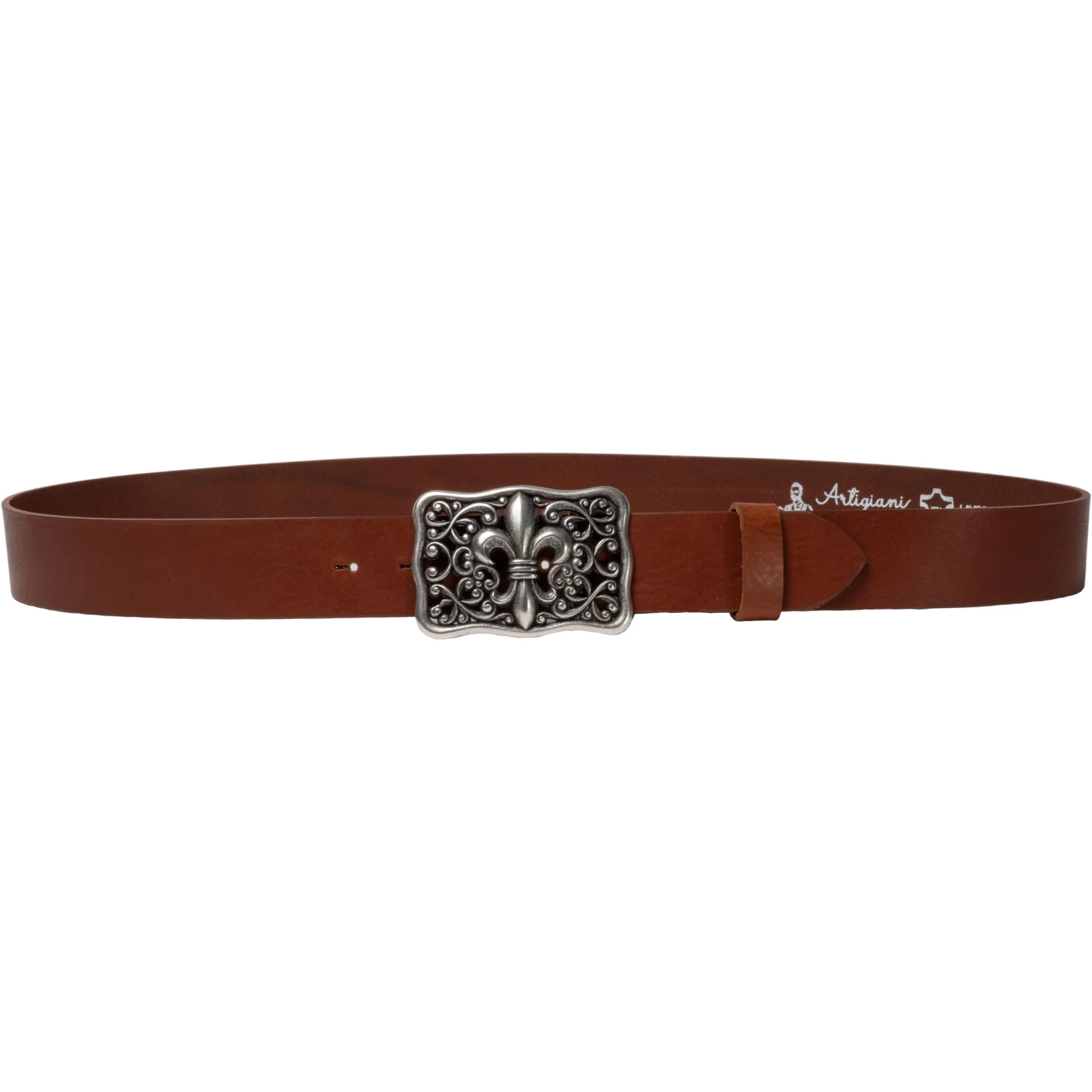 Handmade belt in brown greased vegetable tanned cowhide leather and metal buckle (nickel free) with Renaissance motif with Florentine lily. Completely handmade in Florence with Italian materials and accessories.