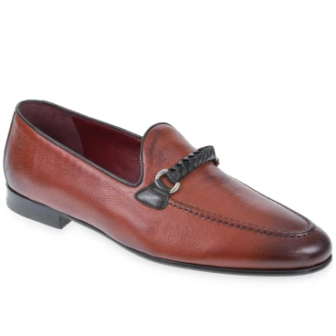Men's moccasin in very soft brick-colored calfskin with woven and hand-shaded loop. Stitched leather sole with non-slip rubber oval and calfskin lining. Made in Tuscany.