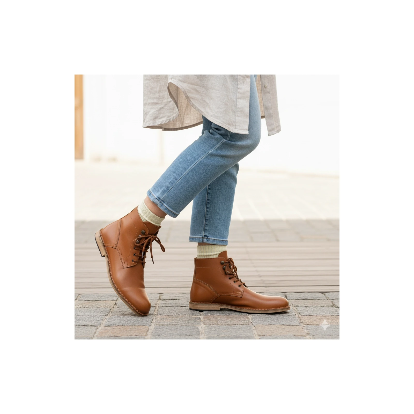 Ankle boots handmade in Italy using a single layer of vegetable-tanned greased tan cowhide leather making the shoe light but resistant. Hypoallergenic in contact with the skin.