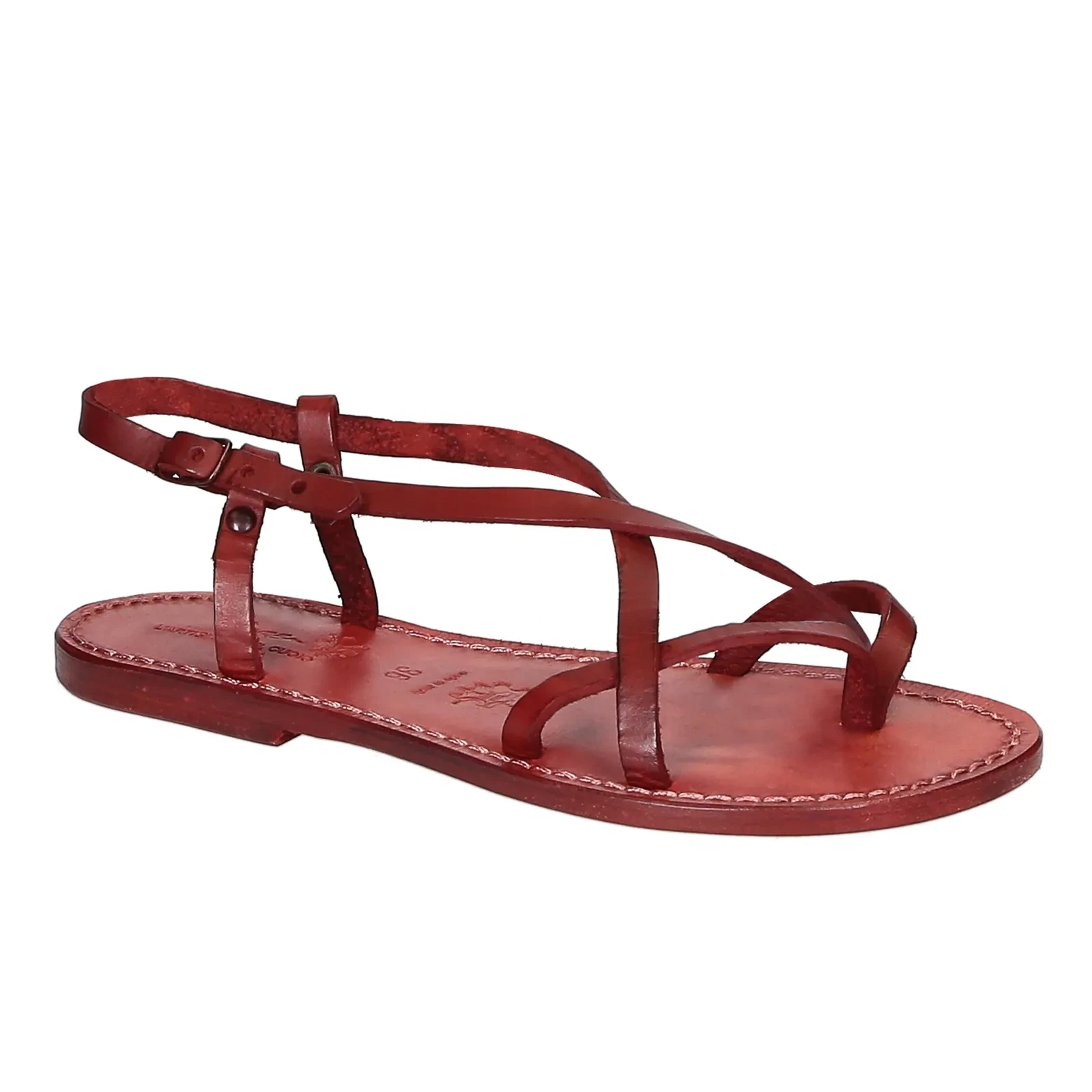 Women's red greased vachetta leather strappy sandals with leather sole handmade in Italy without the use foreign or child labor, but by experts in the best tradition of craftsmanship.