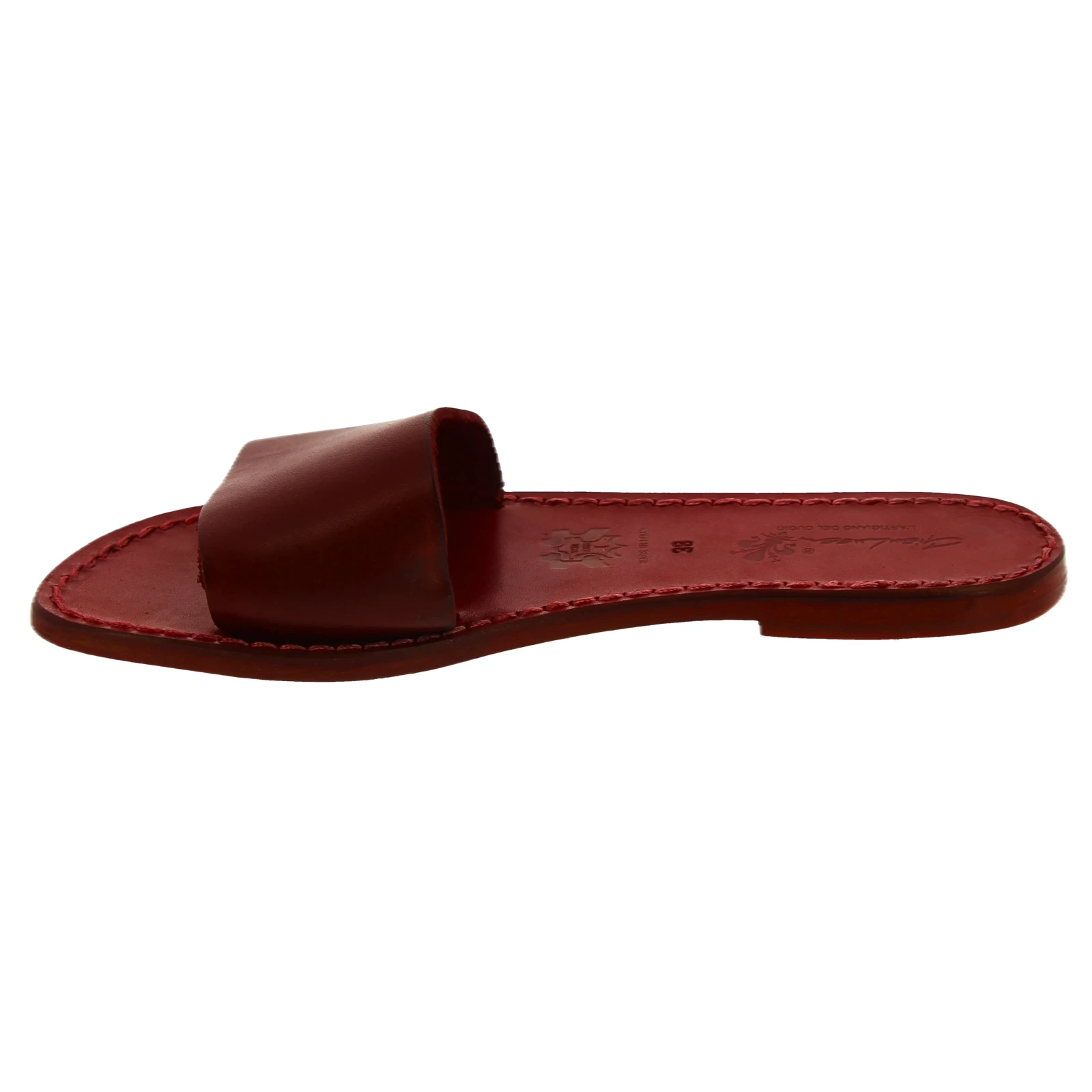 Step into effortless style with our women's red greased cow leather slide sandals, meticulously handmade in Italy. Featuring a premium leather sole, each pair is crafted by skilled artisans who uphold the finest traditions of craftsmanship, ensuring production is entirely free from foreign or child labor.