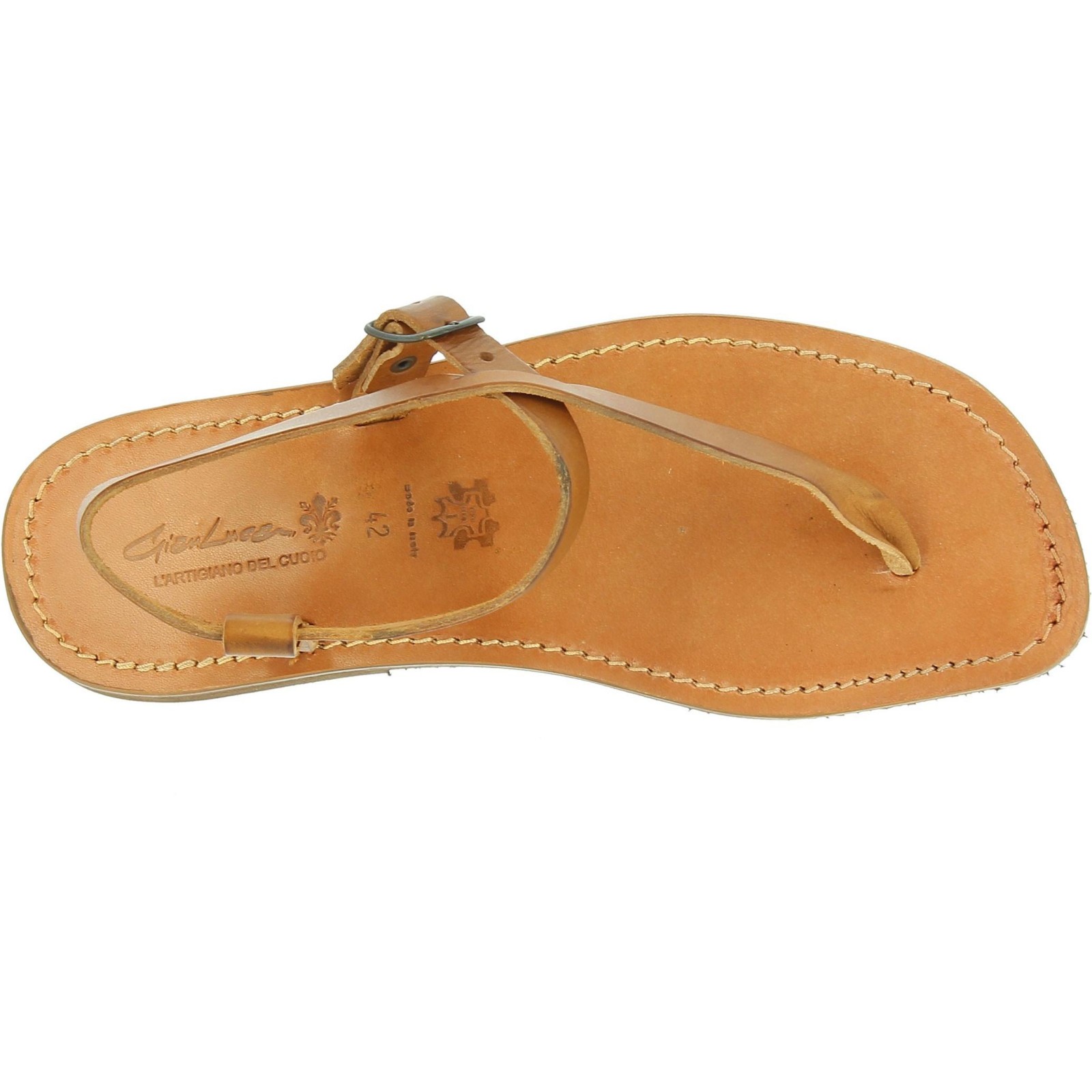 La suela es mano cosida en la plantilla proporciona un acabado superior y durabilidad que el sistema industrial que simplemente se pega. Para la tinción es manual sumergido en un color vegetal, manual de acabado mediante el uso de cepillos pequeños y como paso final, secado al aire libre. Este proceso tiene como resultado una tanga mens sandalias llamadas TUFFATO, que muchas empresas no gastar más porque se requiere un trabajo de precisión que reduce el tiempo de producción.