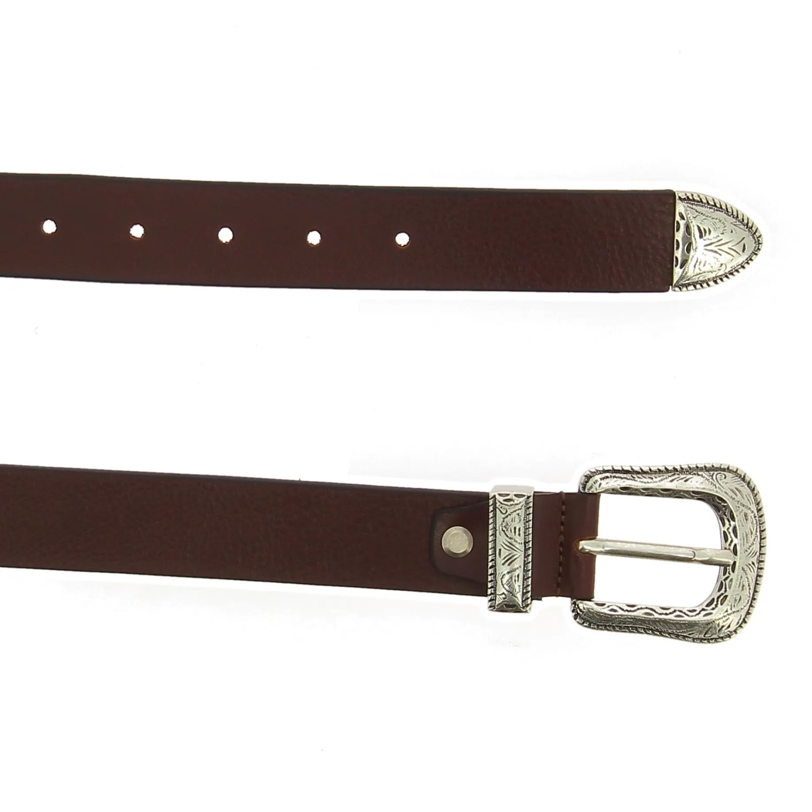 Cinturón wester de cuero marron oscuro para mujer con hebilla de metal