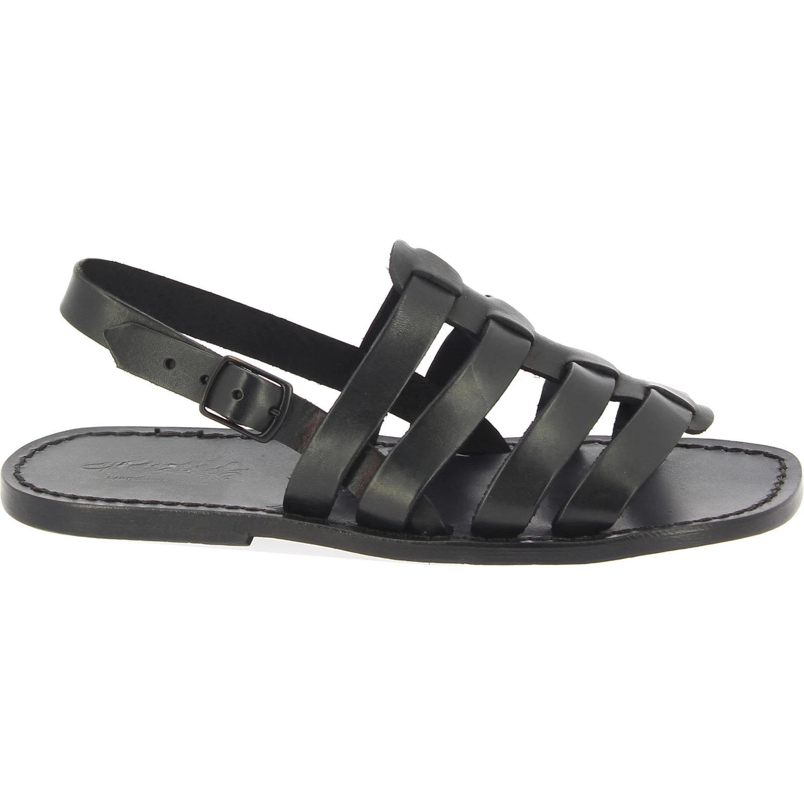 Sandalias jaula sin tanga para hombre en piel de vacuno engrasada color negro con suela de cuero, hechas a mano en Italia sin ayuda de mano de obra extranjera ni infantil, sino por manos expertas en la mejor tradición artesanal.