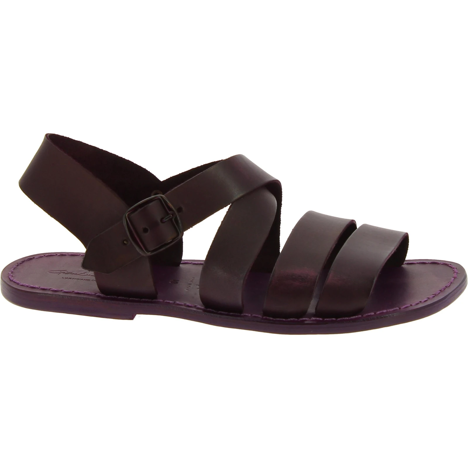 Sandalia para hombre en piel de vacuno engrasada de color vegetal violeta con suela de cuero hecha a mano en Italia