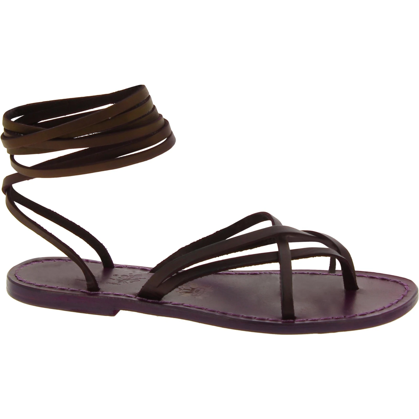 Sandalias tiras de cuero marrón oscuro mujeres hechas a mano en Italia