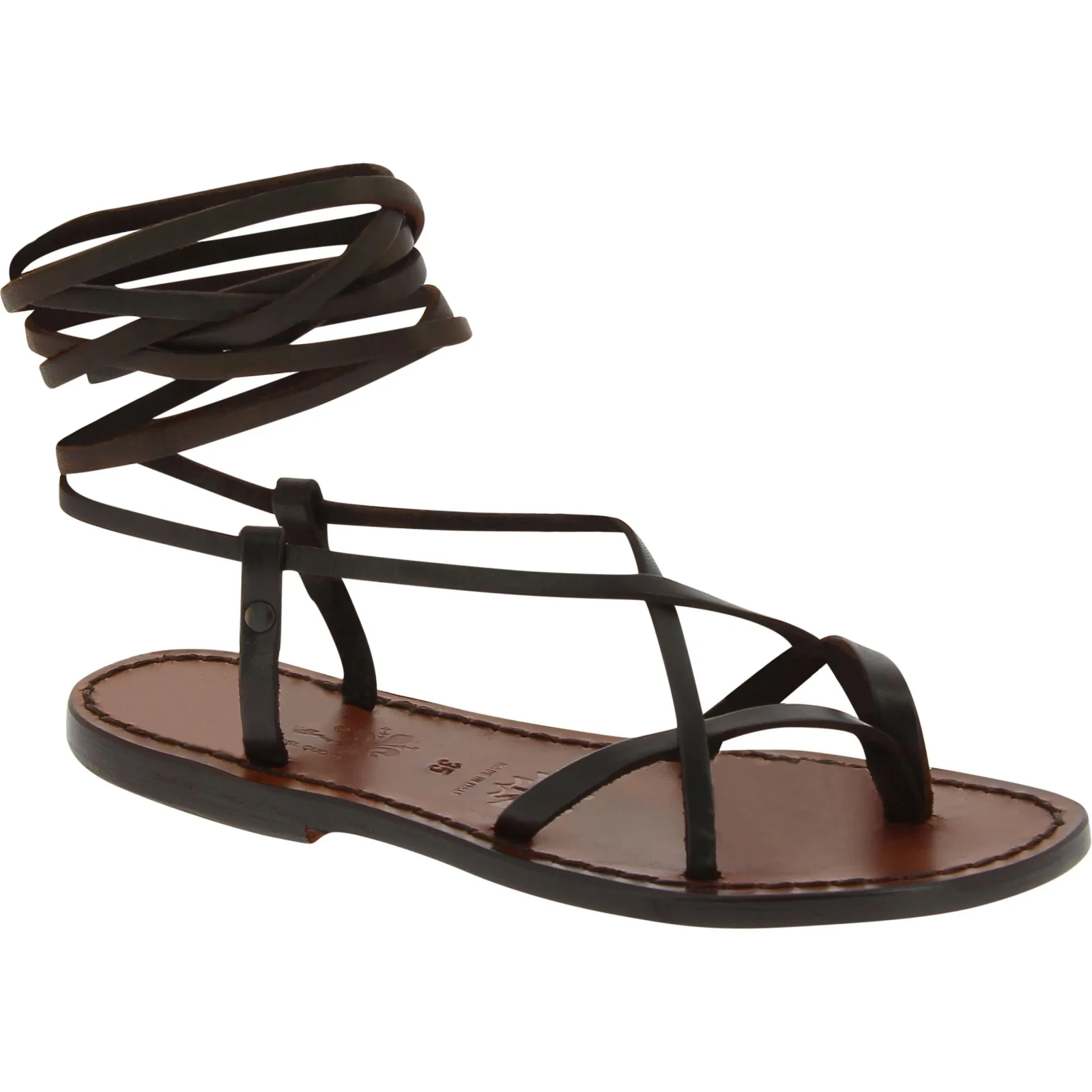 Sandalias tiras de cuero marrón oscuro mujeres hechas a mano en Italia