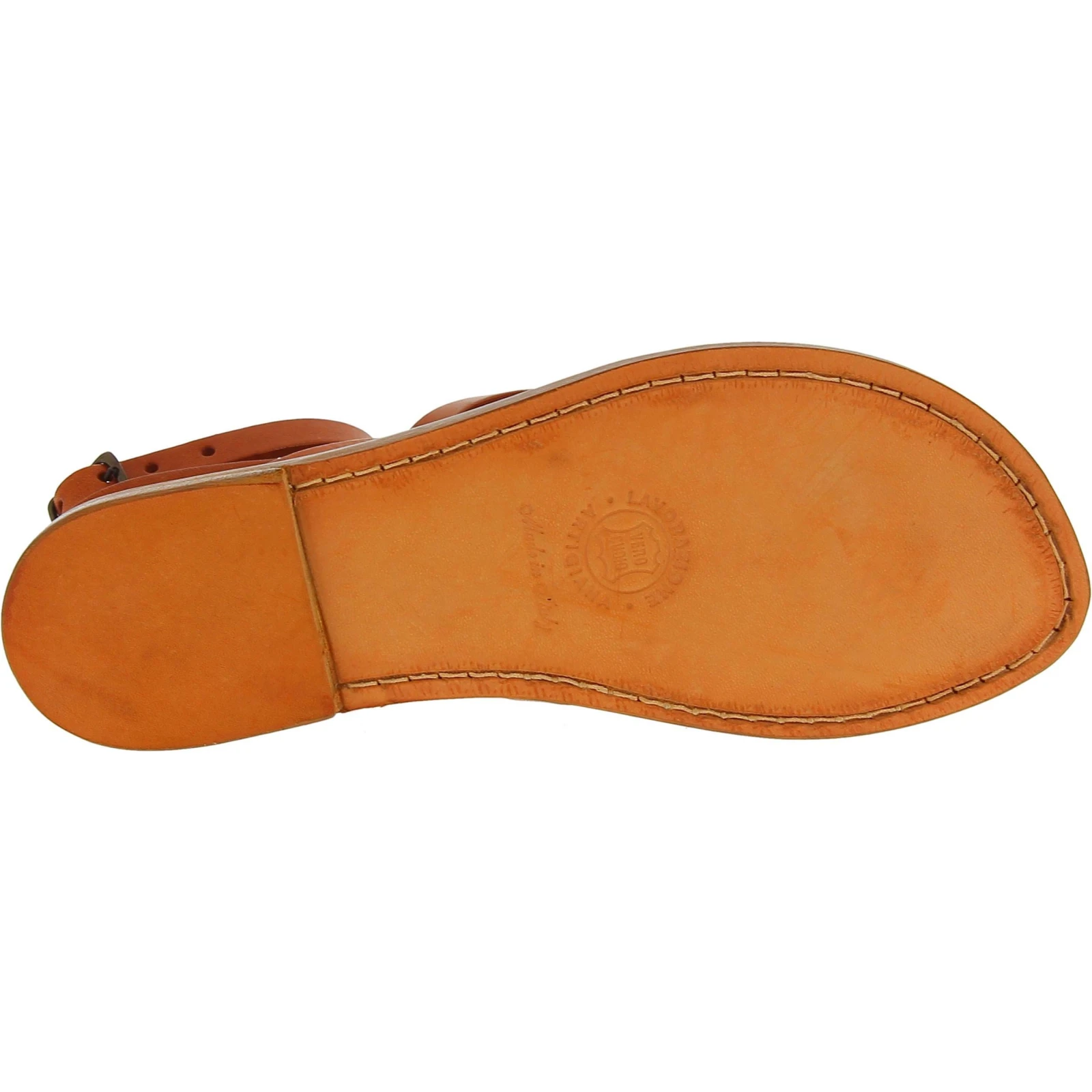 Sandalias de tiras planas de cuero marron para mujer hechas a mano en Italia