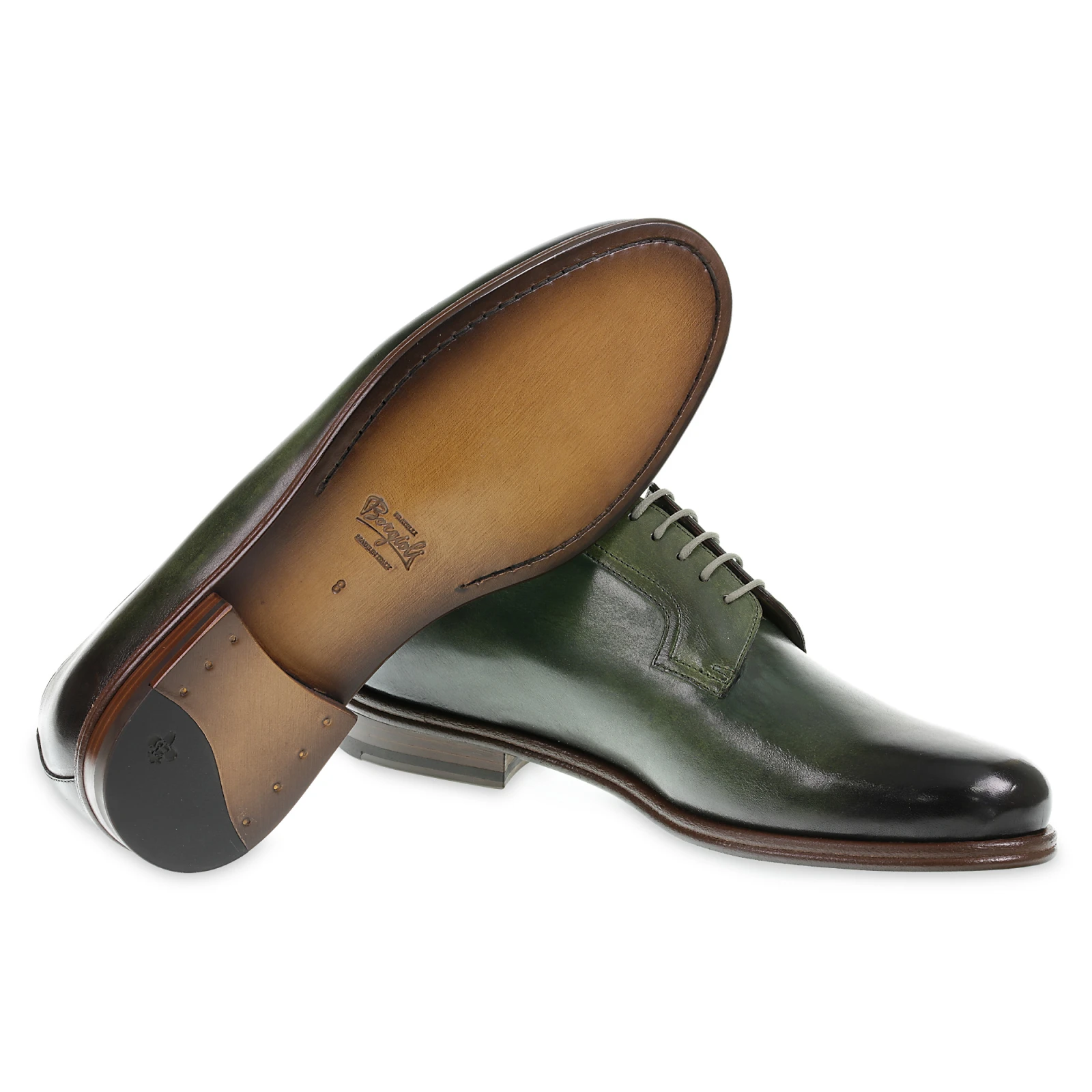 Derby liso en piel de vacuno color verde tamponada a mano con colores naturales y ceras. Parte superior sin costuras. Totalmente hecha a mano con una forma grande y redonda con suela de cuero suave con costuras Blake y tonos aerógrafos. Forro de pantorrilla. Fabricado en Toscana.