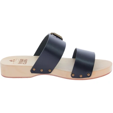 Zuecos de casa en madera de tilo artesanales para hombre con doble banda, una de ellas ajustable, en piel de curtido vegetal color negro.