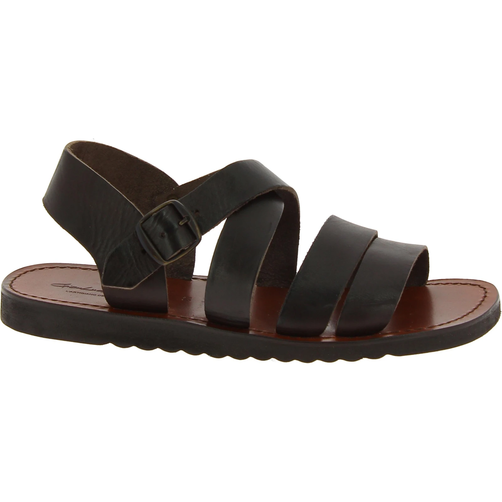 Sandales pour homme en cuir marron foncé. Type franciscain en cuir de vachette végétal graissé avec semelle intérieure en cuir et semelle en caoutchouc épais. Fabrication en Italie par des artisans sandaliers dans le respect des traditions, n'exploitant pas de main-d'œuvre étrangère ni infantile.
