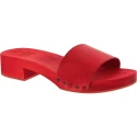 Sabot mule pour femme rouge artisanal en bois de tilleul avec bande en cuir veritable.
