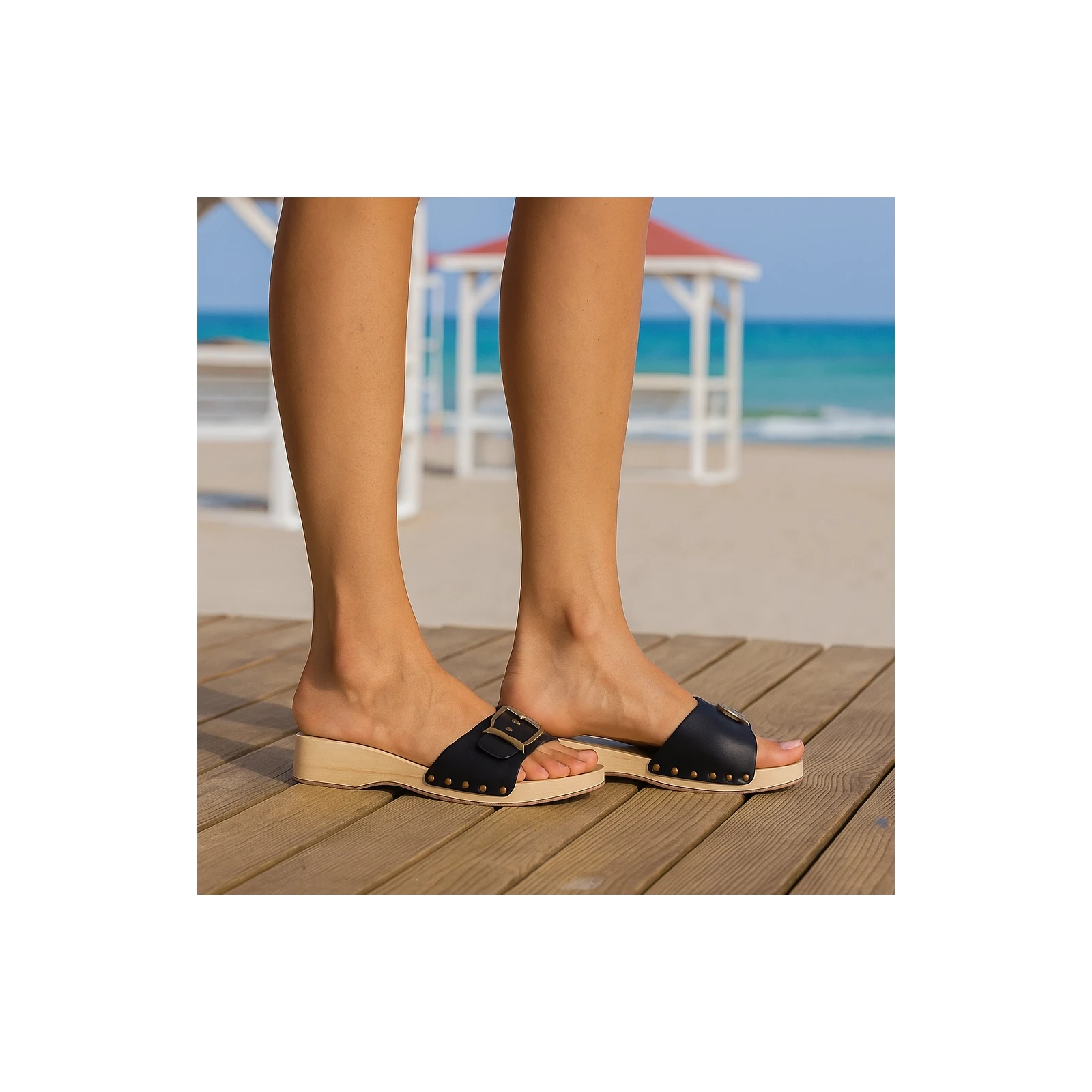 Sabot femme talon bois faits à la main avec bande en cuir noir