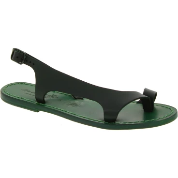 Sandales artisanales pour femme en cuir de vachette végétale graissée couleur vert avec semelle en cuir réalisées à la main en Italie par des artisans sandaliers qui travaillent le cuir dans le respect de la tradition florentine.