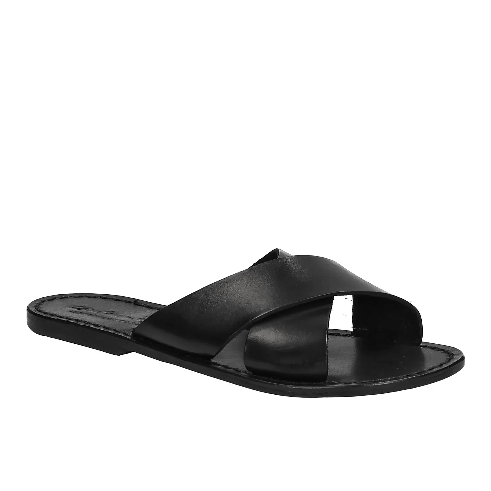 Ciabatte da donna fatte a mano in pelle intrecciata nero con suola in cuoio