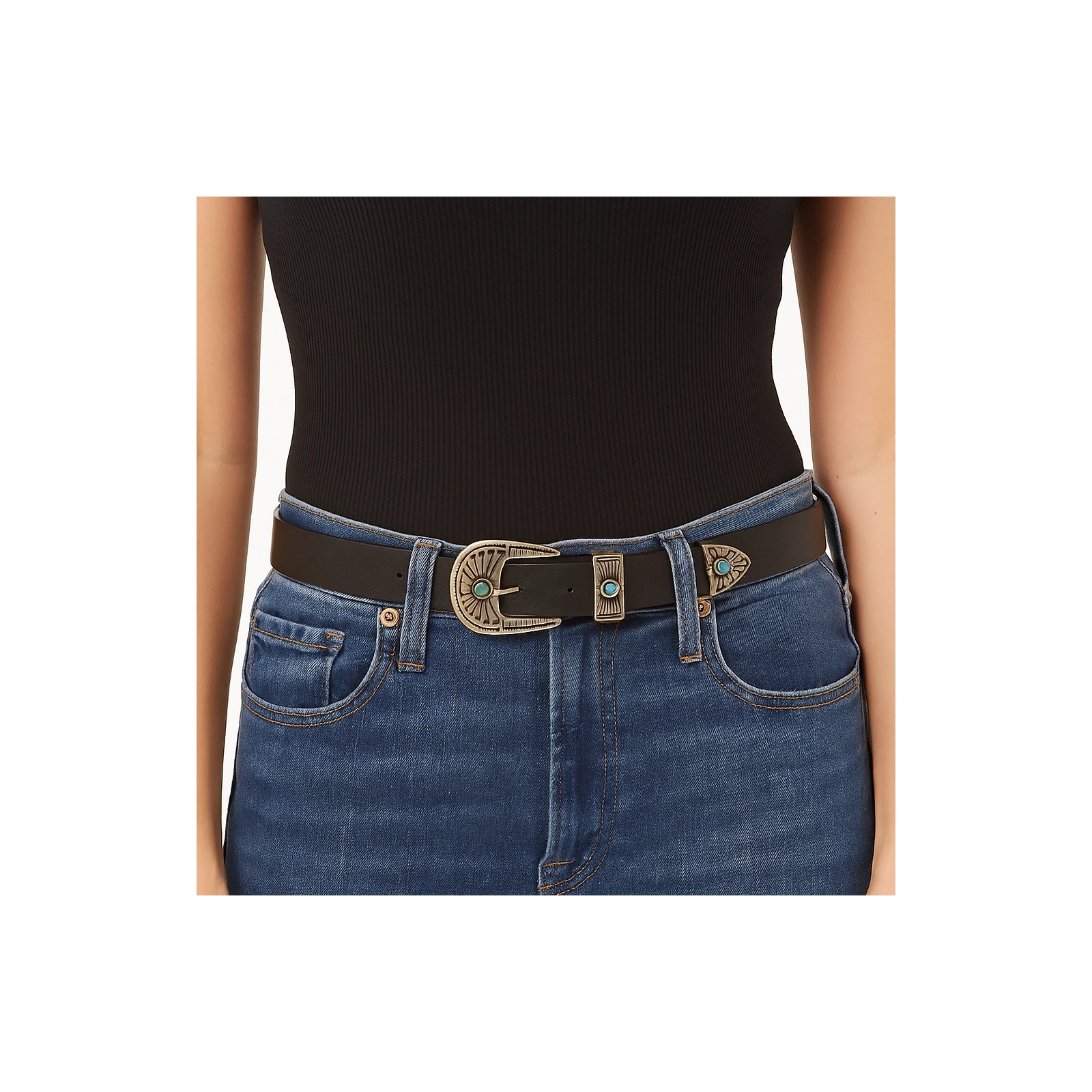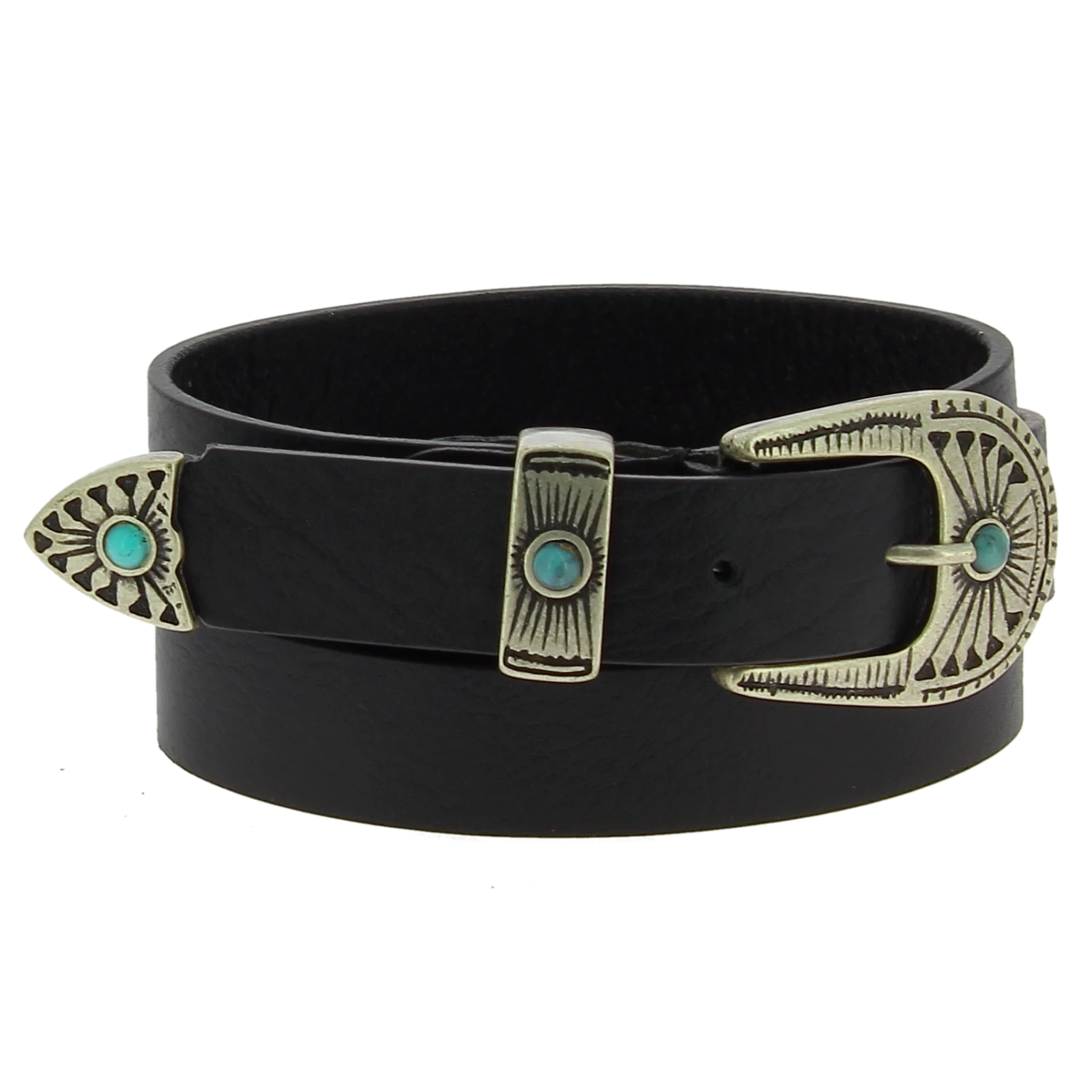 Cintura da donna in pelle di vitello conciata al vegetale color nero con fibbia e puntale in metallo zincato pressofuso (nickel free) con inciso un motivo geometrico e pietrina turchese. Completamente realizzata a mano in Italia con materiali ed accessori italiani.
