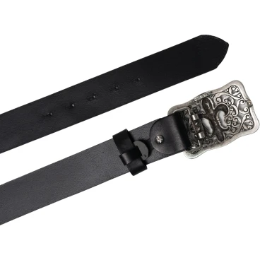 Cintura in pelle nero con fibbia e puntale in metallo inciso