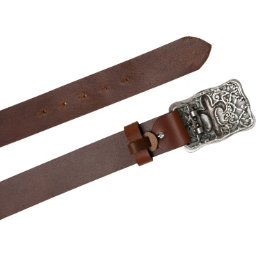 Cintura in pelle marrone con fibbia e puntale in metallo inciso