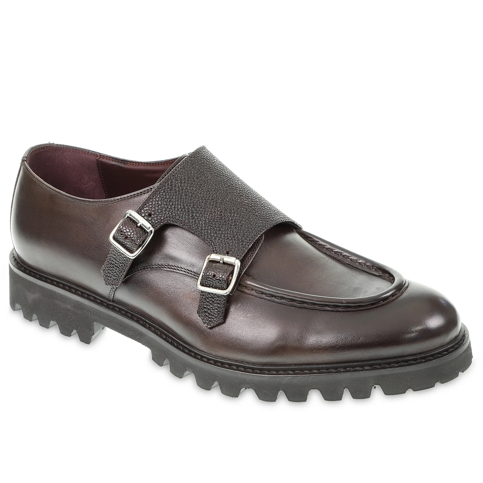 Mocassino doppia fibbia in vitello anticato color ebano interamente fatto a mano su forma larga e rotonda. Suola leggera in gomma espansa che assorbe gli urti e tomaia in vitello anticato e vitello stampato chicco di riso. Pregiata cucitura bordone sulla tomaia e fodera in vitello. Realizzato in Toscana.