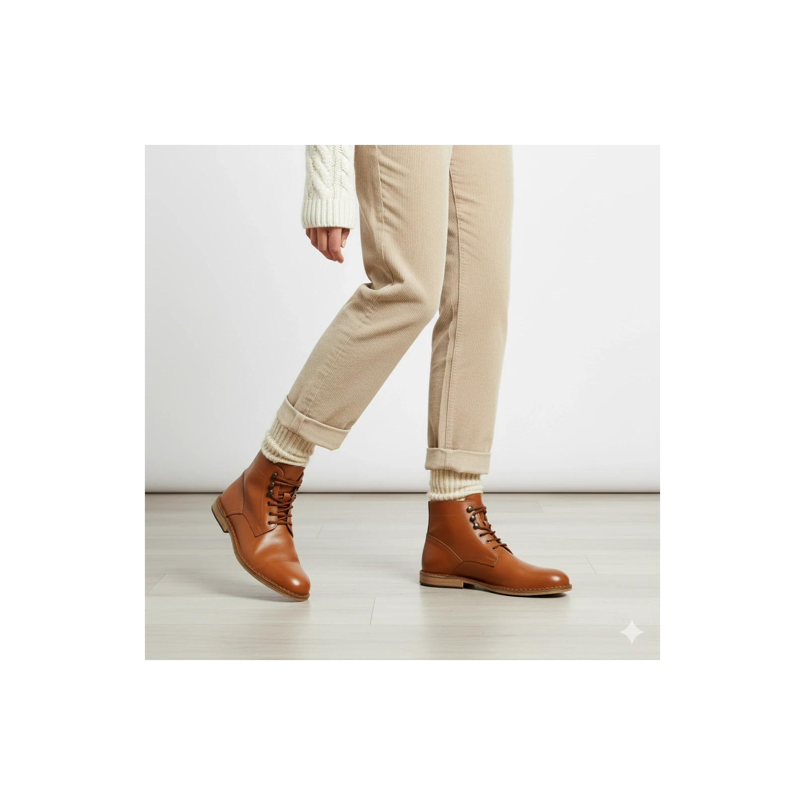 Stivaletti da donna realizzati a mano in Italia utilizzando un unico strato di pelle color cuoio di vacchetta ingrassata conciata al vegetale rendendo la scarpa leggera ma resistente. Anallergica al contatto con la pelle.
