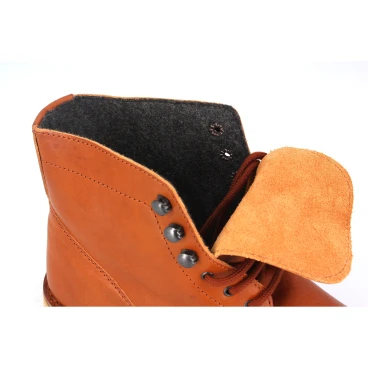 Stivaletti uomo realizzate a mano in Italia utilizzando un unico strato di pelle color cuoio di vacchetta ingrassata conciata al vegetale e fodera invernale. Anallergica al contatto con la pelle.