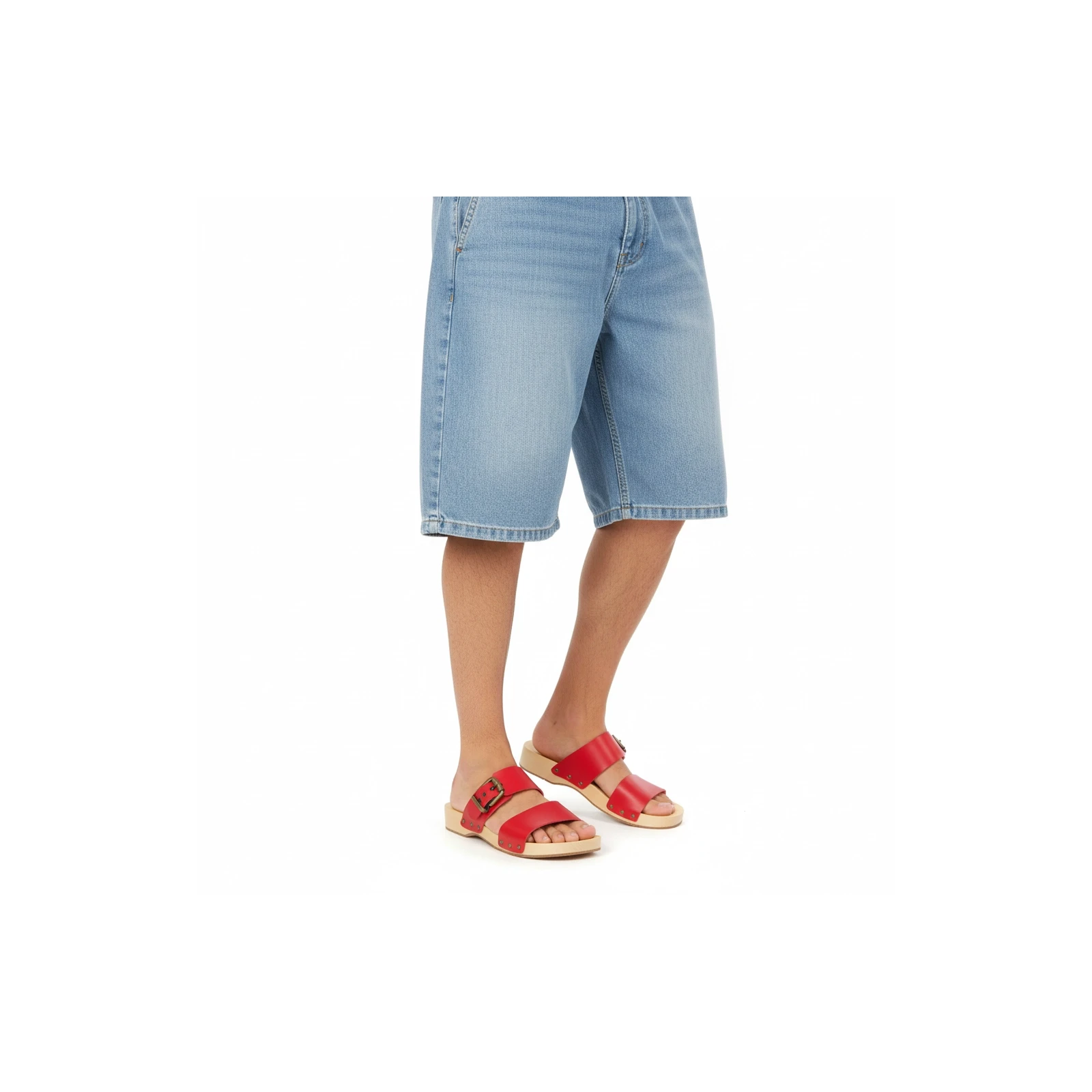 Zoccolo in legno di tiglio artigianale da uomo con doppia fascia, di cui una regolabile, in pelle conciata al vegetale di colore rosso.